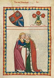 Albrecht von Johansdorf (c. 1180 – c. 1209) was a Minnesänger and a minor noble in the service of Wolfger of Erla. Documents indicate that his life included the years 1185 to 1209. He may have known Walther von der Vogelweide and is believed to have participated in a crusade. He is known to have written at least five "recruitment" songs in Middle High German, most likely for the Third Crusade. His "Song 2" owes a debt to the structure and melody from a song in Old French by trouvère poet Conon de Béthune. His "Song 5", which mentions the capture of Jerusalem, may suggest that he wrote around 1190.[1] Von Johansdorf's Minnelieder conform outwardly to the standard pattern of man subordinating himself to the woman above him and is responsible for the classical formulation of "the educative value of Minnedienst" (daz ir deste werde sit und da bi hochgemuot). His integrity and warmth of heart are most evident in poems referring to the departure for the crusade.