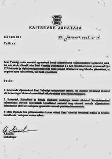 In January 1995, after start of the First Chechen War, Einseln issued a decree stating that in case of foreign troops crossing the border, Estonia Defence Forces must immediately start active resistance, and not cease fighting until ordered so by the President of Estonia. This was seen as attempt to prevent surrender without resistance as had happened in 1939.[4] In 2014, after start of conflict in Ukraine, active Commander-in-Chief general Riho Terras noted that Einseln's decree is still in force.[5]