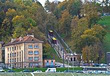 Aleksotas Funicular Railway (Lithuanian: Aleksoto funikulierius) is a funicular railway located in Aleksotas elderate of Kaunas, Lithuania. The funicular constructed on the right bank of the Nemunas River was officially opened on 6 December 1935.[1] The track of the Aleksotas funicular remained unchanged. It is a monorail with a separation in the centre of the track for carriages to pass. Special automatic brakes were installed in carriages not to let them run down in case of cable damage. The length of funicular is 142 metres (466 ft), gradient - 29.5 degrees.[2] Authentic traction equipment, including the genuine pre-war wagons, wooden seats, and stop platforms of the funicular are still used.[3]