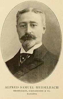 His father Philip Heidelbach died in 1875, and in 1876, Alfred joined the firm of Heidelbach, Ickelheimer & Co., which was founded in 1876 after the marriage of Isaac Ickelheimer to Philip Heidelbach's daughter.[1] This firm made a specialty of foreign exchange and specie and were able to secure valuable connections abroad. He was a director of the United States Life Insurance Company. In 1893, the firm admitted Henry R. Ickelheimer, who represented the interest of his father, Isaac, one of the founders of the concern.