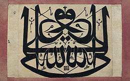 Ali was prominent at the Battle of Uhud, as well as many other battles where he wielded a bifurcated sword known as Zulfiqar.[49] He had the special role of protecting Muhammad when most of the Muslim army fled from the battle of Uhud[1] and it was said "There is no brave youth except Ali and there is no sword which renders service except Zulfiqar."[50] He was commander of the Muslim army in the Battle of Khaybar.[51] Following this battle Mohammad gave Ali the name Asadullah, which in Arabic means "Lion of God". Ali also defended Muhammad in the Battle of Hunayn in 630.[1]