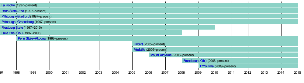 | University of Pittsburgh at Bradford | Bradford, Pennsylvania | Panthers | 1963 | Public | 1,502 | 1997 |
