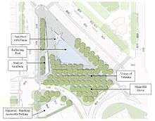 Following the siting guidelines and maps provided by the NCMC, the DVLMF looked at more than 50 potential memorial sites throughout the National Capital Area.[18] Foundation leaders worked closely with D.C. government officials to identify a site.[19] Ten sites were short-listed by the city and foundation,[17] although the DVLMF only seriously considered six of these.[14] The District pushed for the memorial to be located in an existing park-like triangle of land bounded by Washington Avenue SW, C Street SW, and 2nd Street SW.[19] The site was southwest and across the street from the United States Botanic Garden's Bartholdi Fountain Park, and less than two blocks from the United States Capitol.[18] The site was man-made, built using air rights when the tunnel carrying Interstate-395 was constructed from 1965 to 1973.[17] The lot was city-owned, but the city was willing to transfer it to the National Park Service.[17][20][lower-alpha 3][14] Robert Hansen, the foundation's chief operating officer, praised D.C. officials for their assistance.[19] Lois Pope personally agreed to the site selection.[3] Key considerations for the DVLMF were the site's proximity to Capitol Hill, the museums of the Smithsonian Institution, and Washington Metro subway stations.[14] The foundation submitted its site selection report to NCMC in August 2001.[21]