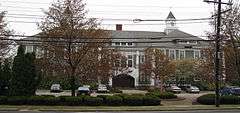 The Ames Schoolhouse is a historic school building at 450 Washington Street in Dedham, Massachusetts. The Colonial Revival structure was built in 1897. It was named in honor of American Revolution-era politician Fisher Ames. It is a large H-shaped brick building, with a central section flanked by symmetrical projecting bays on either side. It has a hip roof with a deep dentillated eave, and pilastered corners. The main entrance is set under broad arch at the center, with a Palladian window above.[2] At the 2014 Spring Annual Town Meeting, the Town of Dedham voted to repurchase the building for $5.85 million and renovate it to be used as a Town Hall and Senior Center.[3]