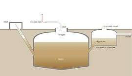 Schematic of an anaerobic digester as part of a sanitation system. It produces a digested slurry (digestate) that can be used as a fertilizer, and biogas that can be used for energy.[60]