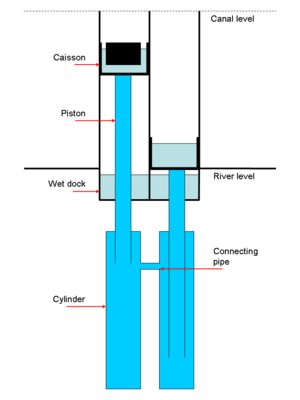 In normal operation the cylinders of the hydraulic rams were connected by a 5 in (130 mm) diameter pipe that allowed water to pass between them, thus lowering the heavier caisson and raising the lighter one. To make adjustments at the start and end of a lift either cylinder could be operated independently, powered by an accumulator or pressure vessel at the top of the lift structure, which was kept primed by a 10 horsepower (7.5 kW) steam engine. If necessary, the steam engine and accumulator could operate either hydraulic ram independently to raise the caissons, although in this mode it took about 30 minutes to raise a caisson, as opposed to three minutes in normal operation.[5]