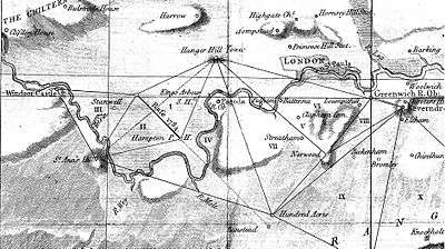 Late in life, when he was 57, Roy was granted the opportunity to establish his lasting reputation in the world of geodesy. The opening came from a completely unexpected direction. In 1783 the Comte de Cassini addressed a memoir[1] to the Royal Society in which he expressed grave reservations of the measurements of latitude and longitude which had been undertaken at Greenwich Observatory. He suggested that the correct values might be found by combining the Paris Observatory figures with a precise trigonometric survey between the two observatories. (The French surveys had already been carried out in the course of the preparation of the map of France.) This criticism was roundly rejected by Nevil Maskelyne who was convinced of the accuracy of the Greenwich measurements but, at the same time, he realised that Cassini's memoir provided a means of promoting government funding for a survey which would be valuable in its own right.[1] Approval was granted and Sir Joseph Banks, president of the Royal Society, proposed that Roy should lead the project. Roy gladly accepted and set matters in motion by submitting to the Crown a grossly-underestimated budget for manpower (by far the largest element) and new precision instruments to be constructed by Jesse Ramsden. The whole project is described in Roy's three large articles in the Philosophical Transactions of the Royal Society of London in 1785, 1787 and 1790.[2] There are shorter accounts of the project in the History of the Royal Engineers by Porter[3] and in every history of the Ordnance Survey, particularly the book by Seymour[4] and also that by Owen and Pilbeam.[5]