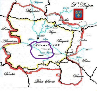In purple: Approximately boundaries of modern Anjou wine region In yellow: the Maine-et-Loire current département.