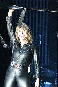 Quatro raising her bass guitar above her head during a rock performance at AIS Arena in Canberra, Australia on 26 September 2007