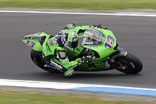 Following the retirement of Olivier Jacque in June 2007, West was offered the position to race with the Kawasaki Racing Team in MotoGP and aboard the Ninja ZX-RR for the remainder of the season, buying out his contract with Yamaha.[4] He made a good debut at the British Grand Prix, reaching fourth position, but then crashing and eventually finishing 11th.[5] His first four races each saw him finish progressively higher, with seventh at Mazda Raceway Laguna Seca and eighth at the Sachsenring.[6] He was seventh again in the wet at Motegi, but could have been even higher. Starting 6th, he jumped the start fractionally – by the time the ride-through penalty was handed out, he was leading the race. Team-mate Randy de Puniet came second amidst an all-Bridgestone podium, emphasising the missed opportunity. In his home country's Grand Prix the Australian's error caused him to only finish 12th while compatriot Casey Stoner won aboard his Ducati.