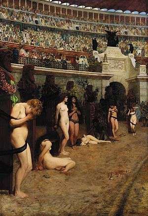 Christians who refused to recant by performing ceremonies to honour the gods would meet with severe penalties; Roman citizens were exiled or condemned to a swift death by beheading. Slaves, foreign-born residents and lower classes were liable to be put to death by wild beasts as a public spectacle.[60] A variety of animals were used for those condemned to die in this way. There is no evidence of Christians being executed at the Colosseum in Rome.[61]