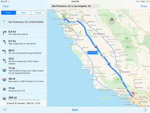Apple Maps can be used to plan routes. The navigation service features turn-by-turn navigation with spoken instructions for vehicles, pedestrians, and public transportation.[52] According to Apple, the navigation function is available in 56 countries worldwide.[53] Apple Maps can also be used to see real-time traffic information. In addition, Apple's virtual assistant, Siri, is integrated into Apple Maps. The map displays points of interest provided by approximately twenty companies, including Booking.com, Foursquare, TripAdvisor, and Yelp. The data from Foursquare was added in late 2015.[50][54] Users can drop pins on the map to save places for later retrieval. The satellite view features Flyovers, three-dimensional satellite views, in designated locations.[55]