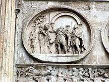 The horizontal frieze below the round reliefs are the main parts from the time of Constantine,[7] running around the monument, one strip above each lateral archway and including the west and east sides of the arch. These "historical" reliefs depict scenes from the Italian campaign of Constantine against Maxentius which was the reason for the construction of the monument. The frieze starts at the western side with the Departure from Milan (Profectio). It continues on the southern, face, with the Siege of Verona (Obsidio) on the left (South west), an event which was of great importance to the war in Northern Italy. On the right (South east) is depicted the Battle of Milvian Bridge (Proelium) with Constantine's army victorious and the enemy drowning in the river Tiber.[7] On the eastern side, Constantine and his army enter Rome (Ingressus); the artist seems to have avoided using imagery of the triumph, as Constantine probably did not want to be shown triumphant over the Eternal City. On the northern face, looking towards the city, are two strips with the emperor's actions after taking possession of Rome. On the left (North east) is Constantine speaking to the citizens on the Forum Romanum (Oratio), while to the right (North west) is the final panel with Constantine distributing money to the people (Liberalitas).[27][28]