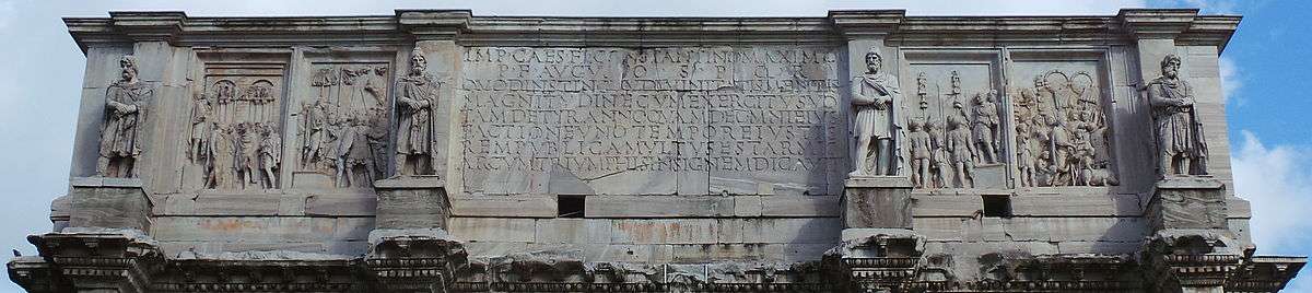 - ↑ By the "Senate and people" (S.P.Q.R.) according to the inscription, though the Emperor may have "suggested". See also: A. L. Frothingham. "Who Built the Arch of Constantine? III." The Attic, American Journal of Archaeology, Vol. 19, No. 1. (Jan. - Mar., 1915), pp. 1-12