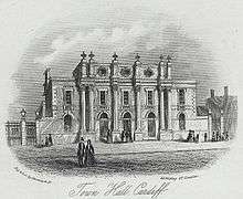 In 1853 a new "graceless but vigorous" colonnaded Town Hall and Corn Exchange (Cardiff's fourth town hall) replaced the old Guildhall in High Street.[6] Horace Jones of London had been the winners of the design competition, controversially, because the cost limit was £8,000, while Jones scheme was estimated at £11,690. The building was extended in 1876 but was eventually replaced in the early 20th century.[9]
