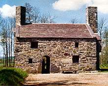 Snowdonia houses have recently been the subject of considerable study by the Royal Commission on the Ancient and Historical Monuments of Wales and the Dating Old Welsh Houses Group.[64] These houses are typical of the Sub Medieval houses appearing in Wales in the earlier part the 16th century, which are a development from the Hall House. Characteristically Snowdonia Houses are now built on a vertical rather than horizontal plan with two or more storeys and lateral chimney stacks set against the end gables. The older cruck construction is now replaced with roofs constructed of trusses and purlins supported on stone walls. The centrally placed doorway may now be set under a massive stone cyclopean arch as at Faenol Fawr, Bodelwyddan or else under a fan arch of stone slabs as at Y Garreg Fawr. Y Garreg Fawr from Waenfawr in Caernarfonshire has been re-constructed at St Fagans and has been dated to 1544[65] The earliest example of a Snowdonia House dated by dendrochronology is Dugoed at Penmachno. This has been dated to 1516–7.[66] The nearby Tŷ Mawr Wybrnant, known as the birthplace of William Morgan, translator of the bible into Welsh has been dated to 1565, but there is evidence that this was the re-building of an earlier cruck hall house of around 1500.[67] The construction of the typical Snowdonia Houses continued into the 17th century, as at Cymbrychan at Llanfair which is dated 1612.[68]
