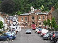 A development of this is Severn Valley Houses which particularly congregate along the Severn Valley in Montgomeryshire especially between Newtown and Welshpool.[62] A typical feature of the Severn Valley houses are the elaborate entry porches to the houses which often have decorative scroll brackets supporting a jettied upper story. These porches often are added features to an earlier timber framed house and lead directly into a lobby entrance. A well known example of the Severn Valley type, which has added timber framed wings to the house is Trewern Hall near Welshpool. A house which has been dated by dendrochronology is Lower Cil on the outskirts of Berriew. This is a well-preserved farmhouse. Its left side is 16th-century (the square framing under the render was felled in 1583), probably a hall-house enlarged when the close-studded taller right end was rebuilt in the early 17th century to provide a new parlour and porch, both slightly jettied. The porch has open sides with turned rails, and the original inner door. The remodelling included the typical Severn Valley lobby-entry central chimney, with its triple-moulded brick stacks.[63]