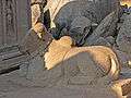 This ratha is similar in form to the Dharmaraja Ratha except that it has one less tier at the top, and has an octagonal dome with a stone lion carved in the front yard. It is a monolithic rock-cut ratha with a garbhagriha (sanctum sanctorum), a dvitala (two-tiered) Vimana (flying aircraft) with a mukhamandapa (inner porch). The stupi at the top has been left uncarved as probably it was meant to fit the shikara (pinnacle) of the vimana; the finial is lying in a platform next to the ratha.[9] The front entry to the temple has two supporting pillars and two pilasters; the latter are carved mounted on lions facing each other. Horseshoe-shaped dormer windows known as kudus adorn the cornices on all four sides; a human face forms part of each side. An oblong gabled structure is carved above one cornice in the middle and two square structures are on the corners. Kudus are also carved in the centre of the gabled roofs.[9] The cutting of joints between the stones, in an irregular and sporadic fashion, have fitted well the architectonic forms as they are aligned in a slope on top of the cornices or cut pilasters; carving of images and decorated motifs are also done across the joints. The sculptors skill in carving has evolved into an almost "invisible jointing system which only enhanced the massive quasi-monolithic quality of the structural stone temple". Surface ornamentation is a prominent feature in the ratha.[12]