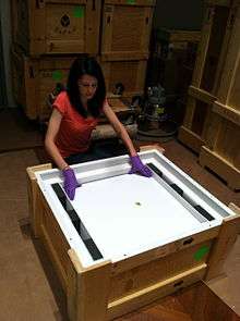 Art handlers and preparators are first and foremost responsible for ensuring the safety of artifacts and works of art. For works traveling out of a gallery or museum, art handlers must carefully pack objects in crates with appropriate materials to protect them from damage while in transit. Some objects may require custom boxes or custom crates that art handlers and preparators might construct on site. Similarly, when objects come into a gallery or museum, art handlers must carefully unpack the objects, paying close attention to how they were originally packed and arranged in their container. Art handlers and preparators also load and unload crates from trucks. When loading crates and packages inside an art transportation truck, art handlers and preparators must be sure to secure the crates and packages to the walls and floor of the truck storage area to prevent any type of movement during transit. Art handlers may also act as a courier, accompanying the object during its transport and being present during its unpacking at the destination. Sometimes art handlers and preparators are responsible for preparing packing and shipping paperwork.[2]