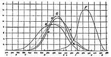 Earlier attempts at such measurements, but based on much simpler technology, had been made in 1860 by the English physicist James Clerk Maxwell (1831–1879). Using newly development spectrophotometric equipment and modifications of the experimental procedure König and Dieterici published a more detailed paper in 1892, determining the "fundamental sensations" not only of subjects with normal color vision (trichromats) but also of dichromats and monochromats.[3]