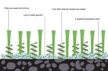 Artificial turf is surface of synthetic fibers resembling natural grass. It is widely used for sports fields for being more hard-wearing and resistant than natural surfaces. Most use infills of crumb rubber from recycled tires, which use is controversial because of concerns that the tires contain carcinogens.[1]