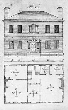 Benjamin's greatest influence, however, is due to his pattern books. They were the first written by an American architect, bringing architectural history, style and geometry to ordinary builders in the field. He adapted many designs by James Gibbs and Colen Campbell of Great Britain to fit the scale and finances of New England communities. These handbooks provided superb drawings and practical advice for full house plans, including such details as circular staircases, doorways, fireplace mantels, dormer windows, pilasters, balusters and fences. He sketched proposals for dwellings and churches, even a courthouse. The archeological sources of his designs were scrupulously cited, from the Temple of Hephaestus in Athens to the Arch of Titus in Rome. Other architects, including Ithiel Town and Ammi B. Young, freely assimilated his plans, as did innumerable carpenters. Indeed, the charm of many early New England towns owes a debt to Asher Benjamin. The Ridge in Orford, New Hampshire features a series of houses based on designs from his books, many of which remain in print.[4] And although he helped disseminate the Federal style, he was not averse to changing fashion. In fact, his book published in 1830, The Architect, or, Practical House Carpenter, helped redirect American taste towards the Greek Revival.