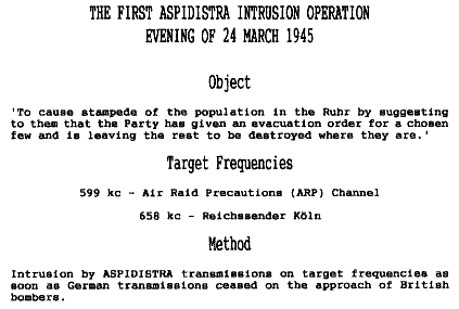 The first such intrusion was carried out on 25 March 1945. On 30 March 1945 Aspidistra intruded on the Berlin and Hamburg stations, warning that the Allies were trying to spread confusion by sending false telephone messages from occupied towns to unoccupied towns. On 8 April 1945 "Aspidistra" intruded on the Hamburg and Leipzig stations to warn of forged banknotes in circulation. On 9 April 1945 there were announcements encouraging people to evacuate to seven bomb-free zones in central and southern Germany. All these announcements were false.