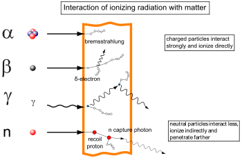 Radiation interaction - gamma rays are represented by wavy lines, charged particles and neutrons by straight lines. The small circles show where ionization occurs.