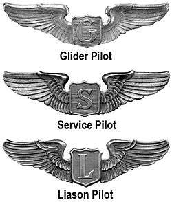 Glider Pilot wings were issued to soldiers who completed training as pilots of military gliders (MOS 1026). The wings were issued initially during the Second World War. Glider Pilots often said that the "G" on the shield stood for "Guts". These wings should not be confused with the Glider Infantry Badge which was created in 1944 to recognize glider infantrymen of U.S. Airborne Divisions.[1]