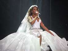 "Ave Maria" was a part of the set list during Knowles' I Am... Tour (2009-2010), where she performed the song dressed in a wedding dress and blended it into Sarah McLachlan's "Angel" (1998).[34][35] The wedding dress Knowles wore during the tour, was originally designed as a black dress and was designed by Thierry Mugler.[36] Her mother and designer, Tina Knowles, made the dress stage-appropriate so Knowles could dance in it.[36] When Knowles performed the song in Sunrise, Florida on June 29, 2009, animated graphics of turntables, faders, and other club gear throbbed behind her and her musicians.[37] Knowles was accompanied by her two drummers, two keyboardists, a percussionist, a horn section, three backup vocalists called the Mamas and a lead guitarist, Bibi McGill.[38] According to Parke Puterbaugh from News & Record, the strangest moment of the concert was Knowles' "unironic delivery" of "Ave Maria", for which she was attired in a wedding dress and veil.[37]