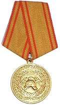 Awarded to military members of civil defense forces with at least 2 years experience in the service, who have achieved high performance in combat training, improved their professional qualifications, for courage, resourcefulness and initiative in the line of duty, and displayed military discipline.[3][27] |