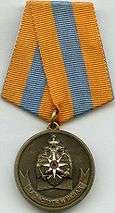 Awarded to personnel of the Ministry of Emergency Situations of Russia, and to other citizens, for merit in strengthening the community of rescue services, for long-term and fruitful work in the field of civil defense, in the protection of populations and territories from emergency situations, from natural and man-made disasters, for ensuring fire prevention and water safety, for providing substantial assistance in the implementation of the goals and objectives of the Ministry of Emergency Situations of Russia.[2][3][9] |