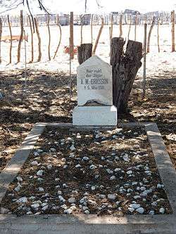 Axel Eriksson died on 5 May 1901 at Urupupa farm.[4] It was said that "when Karuwapa died, the goodness in the country died as well". His grave at Rietfontein, thirty kilometres south west of Grootfontein, was made a national monument in 1978; a sign beside the grave reads: "This is the last resting place of Axel Eriksson, well known traveller, hunter, trader and pioneer, through whose intercession the Cape Government sent food to the distressed thirstland trekkers in 1879 thus rescuing various families from certain death".[3] Despite the grave's status, the site is virtually inaccessible and is not maintained, with its boundary fence no longer intact (as at October 2014).