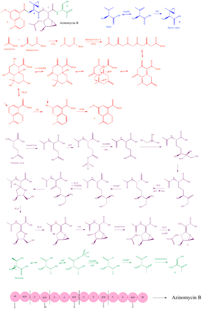 The biosynthesis of azynomycin B includes a type 1 polyketide synthase and several nonribosomal peptide synthetases.[9]
