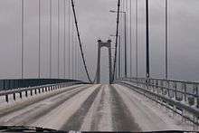 The Bømla Bridge (Norwegian: Bømlabrua) is a suspension bridge which crosses Spissøysundet between the islands of Nautøy in Stord and Spissøy in Bømlo, Norway. The bridge is 998 meters (3,274 ft) long, has a main span of 577 meters (1,893 ft) and a clearance below of 36 meters (118 ft). It carries two lanes of County Road 542 (former National Road 542) and a combined pedestrian and bicycle pathway. It is part of the Triangle Link, a fixed link which connects Stord to Bømlo, and both to the mainland at Sveio. Plans for a crossing arose in the 1960s, and was until the 1990s planned as a pontoon bridge further north. The Bømla Bridge entered the plans after the decision to combine the crossing with the Bømlafjord Tunnel. Construction started in 1999; the bridge cost 342 million Norwegian krone (NOK) and was opened for use on 30 April 2001. The bridge is a toll road.