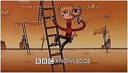 BBC Knowledge was launched in 1999 with the intent of creating a multimedia learning channel.[1] The idea was that computers, interactive TV via the Red Button and television could come together to make a new, factual, learning channel for kids and adults alike.[1] The launch identity consisted of cartoon characters climbing 'ladders of learning' between clouds against an orange background.[1][2] All the idents featured the station logo, which followed the BBC style design of the time by having the station name follow the BBC logo in upper case. This white logo would appear at the end of ident.[1][2]