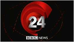 Promotions for the channel changed with the new look, with the channel adopting a box logo of a dark red colour with an upper case 'News 24' below the BBC logo in white inside.[7] The box is located throughout the promotion to the lower right corner of the screen.[7] The channel also began to change their font, making greater use of the Arial font alongside the Gill Sans logo.[16][17]