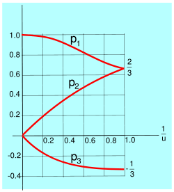 Figure 1 is a plot of p1, p2, p3 with an argument 1/u. The numbers p1(u) and p3(u) are monotonously increasing while p2(u) is monotonously decreasing function of the parameter u.