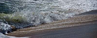 Swash, or forewash in geography,(the white part of the water) is known as a turbulent layer of water that washes up on the beach after an incoming wave has broken. The swash action can move beach materials up and down the beach, which results in the cross-shore sediment exchange.[1] The time-scale of swash motion varies from seconds to minutes depending on the type of beach (see Figure 1 for beach types). Greater swash generally occurs on flatter beaches.[2] The swash motion plays the primary role in the formation of morphological features and their changes in the swash zone. The swash action also plays an important role as one of the instantaneous processes in wider coastal morphodynamics.