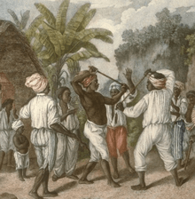 The earliest reference to stick fighting in the Caribbean was from a lithograph completed in Dominica in 1779 by an Italian artist, Agostino Brunias.[2] In the image, there are two persons in the middle and other stick fighters and watchers gathered around them; some who are willing to fight and others that are old and experienced observing and refereeing the fight.