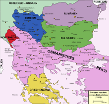 The First Balkan War (Bulgarian: Балканска война, Greek: Α΄ Βαλκανικός πόλεμος, Serbian: Први балкански рат Prvi Balkanski rat, Turkish: Birinci Balkan Savaşı), lasted from October 1912 to May 1913 and comprised actions of the Balkan League (Bulgaria, Serbia, Greece and Montenegro) against the Ottoman Empire. The combined armies of the Balkan states overcame the numerically inferior and strategically disadvantaged Ottoman armies and achieved rapid success.