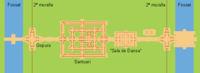 The second enclosure, which is part of the main temple, measures 58 m × 50 m (190 ft × 164 ft). It has a gopura on its eastern side and also subsidiary gopura on the west. Entrance doors are at the northern and southern ends.[4] The gopura is built like a gallery with one exterior wall and double row of pillars which open into a courtyard and which has mostly shored up walls with small openings at the bottom to allow air circulation. The niches here are decorated with images of apsaras, and a Buddha statue in the central hall has been defaced by vandals. Bayon style architectural features built-in are the "balustered false windows with lowered blinds and devatas with headdresses in the form of small flaming discs set in a triangle." The vaults built in sandstone and laterite have collapsed at several locations of the gallery.[12] The inner enclosures contain library building to its north and south and also a central sanctuary.[7]