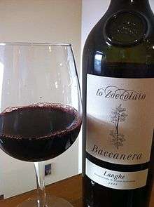 As with many grapes that are widely planted, there is a wide range of quality and variety of Barbera wines from medium bodied, fruity wines to more powerful, intense examples that need cellaring. Some characteristics of the variety are more consistent—namely its deep ruby color, pink rim, noticeable levels of tannins and pronounced acidity.[2] The acidity of Barbera make it a valued plantings in warm climate regions where acidification is usually needed. The color of Barbera makes it a value blending grape and it was historically used in the Barolo & Barberesco region to add color to the naturally light Nebbiolo grape.[1]