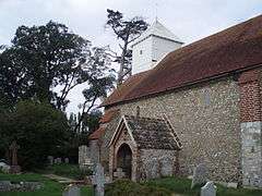 The parish church, dedicated to St Mary, was given to the Abbey of Lessay in Normandy in 1105 and later passed to Boxgrove Priory.[4] There is an elaborate carved rectangular font of Sussex marble.[5] The white wooden tower was once regarded as an important aid to shipping in the English Channel.