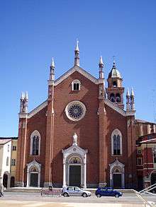 The church was built in 1480 using designs by Gilberto Manzi for a Latin cross layout. The belltower (1881) was added by Gaetano Guglielmetti. The interior conserves a valued polyptych, composed by twelve pieces, by Filippo Mazzola, the father of Parmigianino. The left aisle has the sculpturally elegant mausoleum (1499) of the Pallavicini family, including Gianludovico and his wife. The works are attributed to the school of Amedeo. The chapel of the Rosary contains a canvas of Madonna, Child and st Louis Gonzaga by Pompeo Batoni, and a restored Pieta by Il Pordenone. In the crypt is a fresco depicting Christ emerging from the Tomb (1522) attributed to Antonietto de' Renzi.[1]