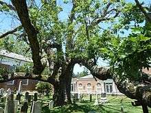 - ↑ A Walking Tour of Historic Basking Ridge Village, The Historic Society of the Somerset Hills. Accessed July 2, 2016. "Over the tombstones broods the ancient White Oak (Quercus alba), more than 600 years old. It stands tall at 97', with a spread of 156' and a circumference of 18'."