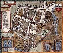 Bath's first walls were built by the Romans, to surround their town (known then as Aquae Sulis), probably in the 3rd century.[2] The Anglo-Saxons by the 10th century had established Bath as a fortified burh (borough) at Bath, utilising the existing town walls, and maintaining Bath as a centre of regional power.[3] Bath, located along the northern edge of the kingdom of Wessex, would have guarded against any attack from neighbouring Mercia, which was held by the Danes for a time.[4]