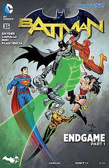 - Snyder, Scott (w), Capullo, Greg (p), Miki, Danny (i)FCO Plascencia (col)"Endgame: Part One" Batman 35 (December 2014), New York, NY: Detective Comics