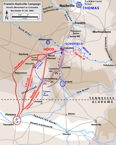 Hood's headquarters departed Florence at 10 a.m. on November 21, accompanied by Cheatham's corps toward Waynesboro, which they reached on November 23. The army marched in three columns, with Cheatham on the left, Lee in the center, and Stewart on the right, all screened by Forrest's cavalry. Hood's plan was to consolidate his army at Mount Pleasant and from there move to the east to cut off Schofield before he could reach Columbia and the Duck River. The rapid forced march 70 miles north was under miserable conditions, with freezing winds and sleet, which made progress difficult for the underfed and underclothed army. Nevertheless, Hood's men were in good spirits as they returned to Tennessee.[8]