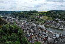 In 1914, the town had a population of 7,000 people and was an important strategic crossing on the Meuse, where the river flows through a south–north gorge. Three roads and a path converged on the town from the east, over an escarpment and down into the town, along which an attack from the east would come. The wooded ridge on the east bank was topped by the Napoleonic era stone Citadel of Dinant overlooking the town and the Meuse bridge, 100-metre (330 ft) below.[1] In 1914 there was a ribbon of streets about 4 kilometres (2.5 mi) long on the east bank, a few hundred metres wide.[2] Before the battle, the Mayor of Dinant urged the population to not take part in the fighting and forbade manifestations in support of the Allies.[3]